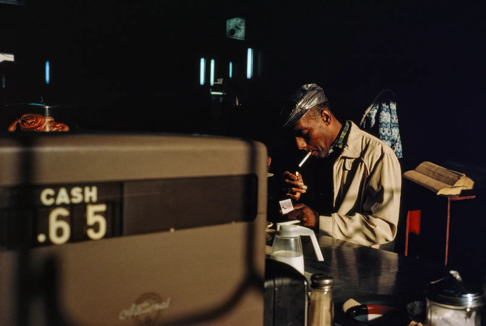 One Winogrand subject that takes on more heft in color is American emptiness—a void in the social landscape that appears all the more unnerving in wide-open spaces. Somewhere in flat and dusty Texas, a man with a red flag raises his arm to warn of road work ahead. In some New Jersey scrubland, two telegraph poles interrupt a low skyline whose only attraction is a big red Coca-Cola sign in the distance. But the void is everywhere. A boxing match, location unknown, is shot from such a low angle that all we see is the raised red glove of one fighter and a pair of overhead lights in the dark ceiling, observing the scene with alien eyes. Winogrand was never big on the uncanny. He was more plainspoken, not always serious but never flip. However he navigated the world, he didn’t miss a thing, and he left all of it behind for us to dig through, rediscover, and puzzle over.